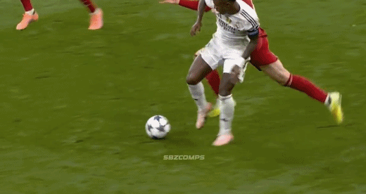 利物浦禁区之内,维尼修斯90度变向,布拉德利也迅速转身防守。维尼修斯假摔骗点,未能骗过裁判;